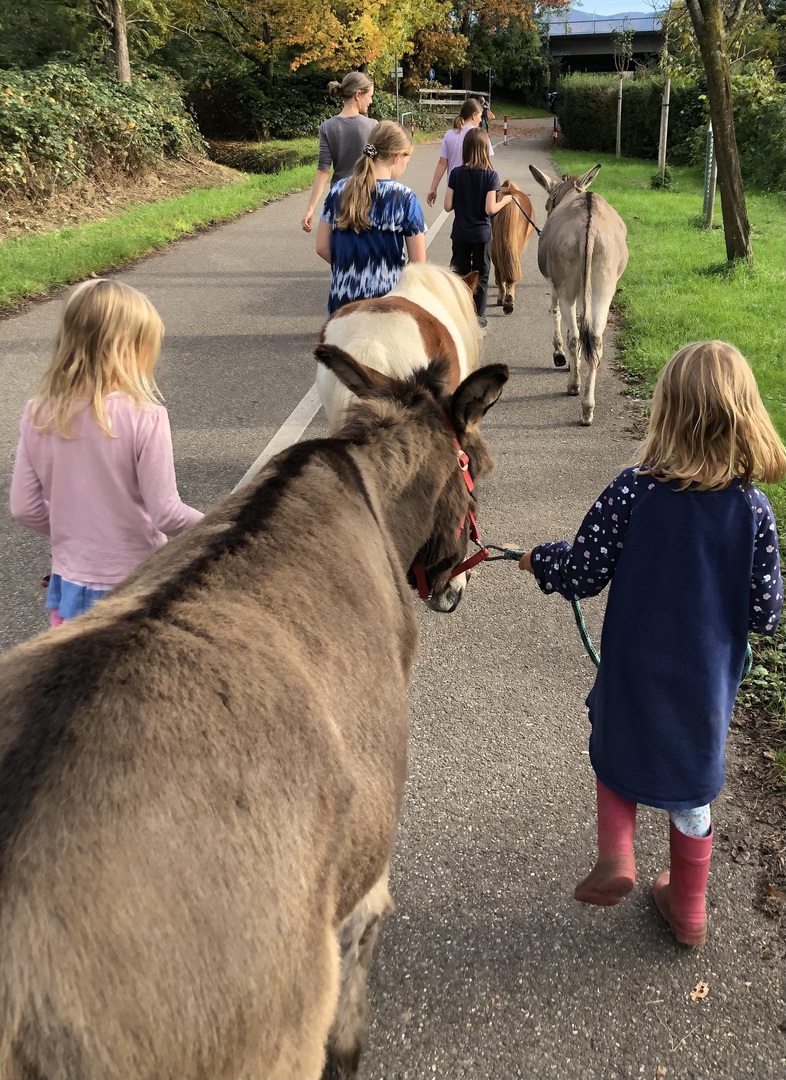 Wir holen die Ponys und Esel gemeinsam von der Weide oder dem Paddock, Halftern auf, putzen und gehen gemeinsam spazieren.